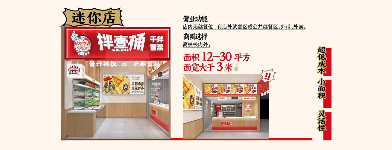 點單模式為消費者通過自選菜品后稱重付款進行選購,米飯免費自助,產品以“拌”為核心,以干凈、休閑、活力的形象出現,力求在工作、學習生活中打造快節奏餐飲體驗。在門店日常經營中, 操作簡單,出餐速度快,無需單獨的湯底,只需在翻滾的大鍋中燙熟然后加入秘制即食調料,在專用容器中攪拌出餐,這就是干拌冒菜。